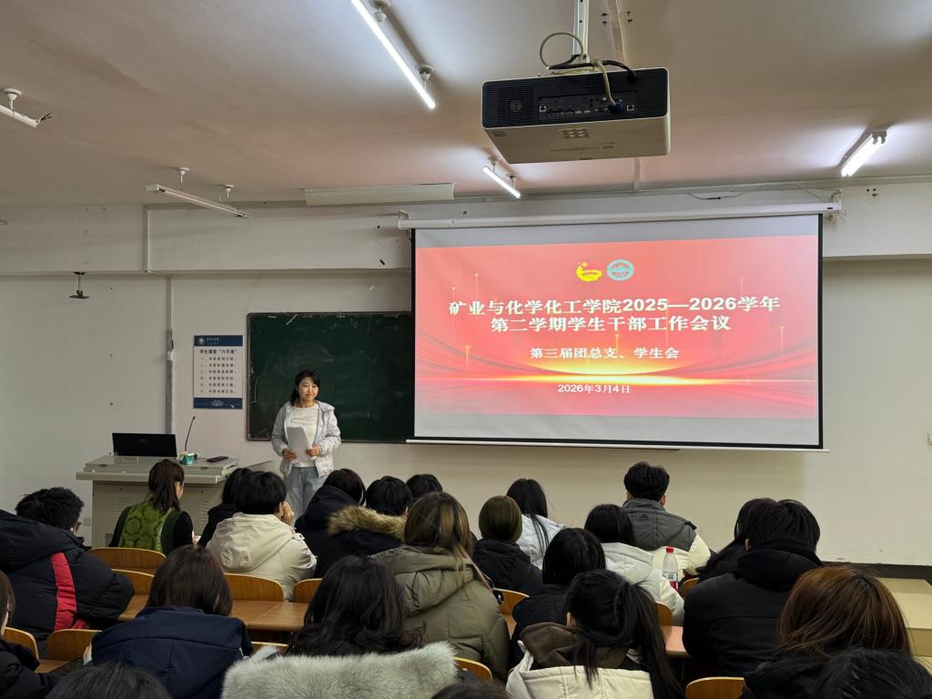 为确保新学期学生工作高起点开局、高标准推进,进一步强化学生干部队伍建设、提升履职尽责能力,3月4日晚,矿业与化学化工学院于科技楼323教室召开2025-2026学年第二学期学生干部工作会议。会议由团学办公室主任、团总支书记闫微主持,团学办公室副主任张雪莹,第三届团总支、学生会全体成员、青年志愿者协会负责人及化海实践宣讲团负责人共60余人参加会议。